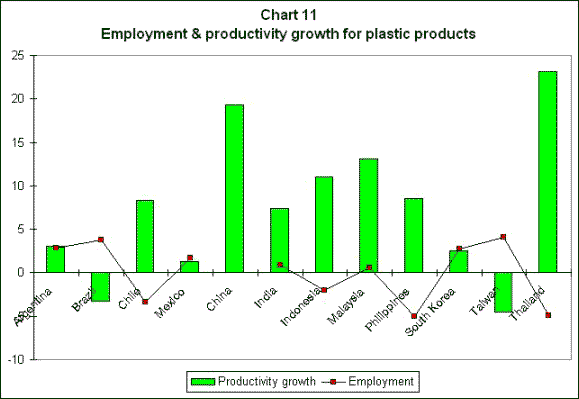 The other major categories in which developing country manufactured exports have grown significantly and in which developing countries as a whole have increased their shares of world markets, are plastic products and fabricated metal products. Charts 11 and 12 show employment and productivity growth for major developing country exporters. Once again, the inverse relation appears to operate, barring some spectacular outliers such as Thailand in the case of fabricated metal products (in which the high rates of employment and productivity growth are both upon low bases).