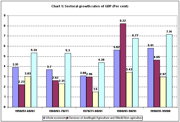 The evidence of an acceleration in GDP growth in India increases, aided on occasion by periodic revisions in the base year used for constructing the estimates. While the factors accounting for this acceleration are still being debated, another unusual feature of this growth since the 1980s has received less attention: the growing disproportionality between agricultural and non-agricultural growth. Using GDP figures with 1993-94 as base, S. Sivasubramonian estimates that the rate of growth of GDP in the agricultural and allied sectors rose from 1.5 per cent during 1970/71-80/81 to 3.43 during 1980/81-90/91, and then declined to 2.97 per cent during 1990/91-99/00. Over the same periods the rate of growth of non-agricultural GDP accelerated from 4.38 per cent to 6.37 per cent and 7.14 per cent respectively (Chart 1). (The figures for output in the form of ''services of dwelling'' are separated out from that of the non-agricultural sector for these calculations.)