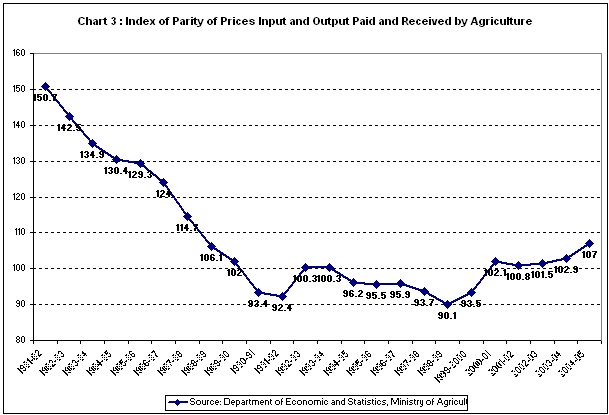 The net result of all this is that agriculture is increasingly faced with a growing demand constraint at a time when input costs are rising. This is a reversal of the situation prevalent till the 1980s when the agricultural supply constraint constituted a barrier to rapid non-agricultural growth. As a result, as Chart 3 indicates, the input-output price parity in agriculture, which moved in favour of agricultural producers during the 1980s, has stagnated and moved against agricultural production during the liberalisation years since the early 1990s.